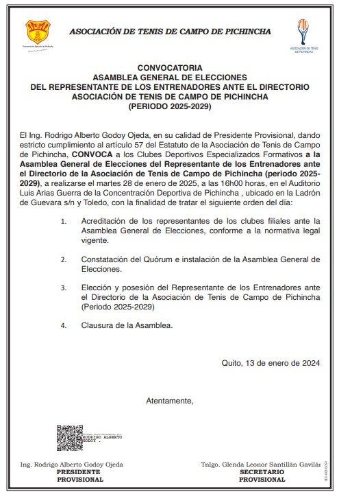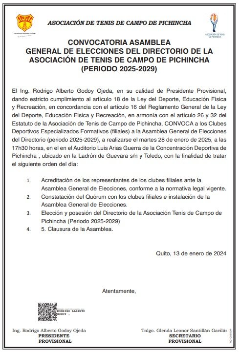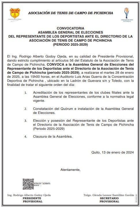 El Ing. Rodrigo Godoy , en calidad de presidente provisional de la Asociación de Tenis de Campo de Pichincha convoca oficialmente a los Clubes Deportivos Especializados Formativos, quienes cuentan con voz y voto y a los clubes filiales a la Asociación quiénes cuentan con voz más no con voto a participar en la Asamblea General de Elecciones para el período 2025-2029 .